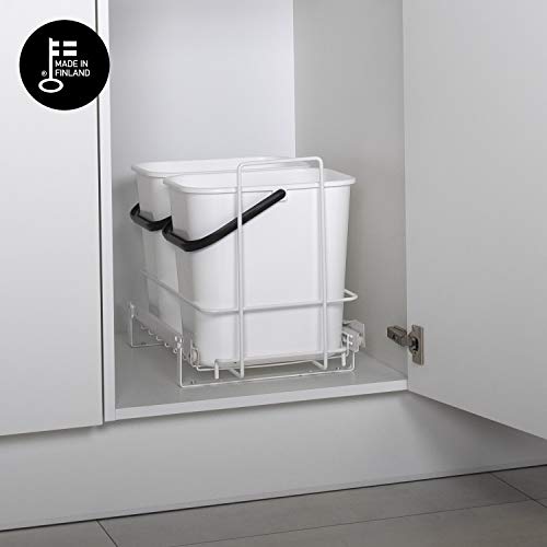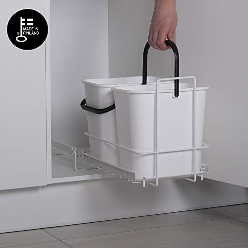 Een handige uittrekbare afvalbak met twee bakken maakt het recyclen van het afval gemakkelijk. Glijdt licht uit de kast en is eenvoudig te installeren. Vervaardigd in Finland.