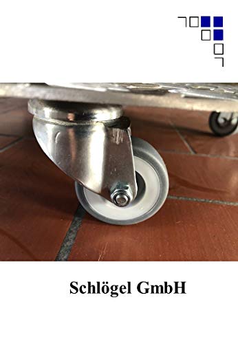 Plantenroller vierkant metaal belasting tot 200 kg Ideaal voor binnen en buiten draagplaat van aluminium plaat Duet wrattenplaat 2,5/4 of 3,5/5 of 5/6,5 naar keuze! 4 x hoogwaardige, stille en vloervriendelijke zwenkwielen thermoplastisch rubber (TPE) met een wieldiameter van 50 mm 2 x met parkeerrem thermoplastisch rubber is een materiaal met een zeer lage zwenk- en rolweerstand en biedt een hoog en geluidsarm rijcomfort. De rol heeft een hoge chemische bestendigheid, zelfs tegen vele agressieve media. Te gebruiken bij een temperatuurbereik van -20 graden tot +60 graden. Thermoplastisch rubber is vloervriendelijk en spoorloos. Het zwenklager heeft een dubbele kogelkrans en is afgedicht met een kunststof ring. De vergrendeling vergrendelt de zwenk- en wielbeweging tegelijkertijd. Totale hoogte ca. 75 mm, draagvermogen tot 200 kg. Draagplaatgrootte in vierkant 250-750 mm naar keuze. Geen uitstekende schroefkoppen. Handgemaakt in Baden-Duitsland!